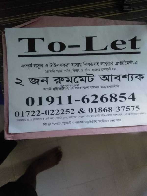 #বিঃ#দ্রঃ পুরো বিজ্ঞাপনটি পড়ে/বুঝে ভাড়া নিতে ইচ্ছুক হলে, বাসা দেখার জন্য কারওয়ান বাজার মোড় অথবা বসুন্ধরা সিটির সামনে এসেই কেবল ফোন দিবেন। অহেতুক ফোন দিয়ে বিরক্ত করবা না। আমামি ১লা জুলাই ২০১৯ হতে - সম্পূর্ন টাইলসকৃত, লিফট, জেনারেটর, ২৪ ঘন্টা গ্যাস, পানি ও বিদ্যুৎ সুবিধা সহ লাক্সারি নতুন এপার্টমেন্টেঃ- ২-৩ জন ব্যাচেলর ছাত্র/চাকুরিজীবি/ব্যবসায়ি পুরুষ রুমমেট আবশ্যক। ★এটাচ বাথরুম ও বেলকুনি সহ ৪ জনের এক রুমে দুই জন রুমমেট আবশ্যক; ভাড়া=৩২৫০/-৳ প্রতিজন। ★এটাচ বাথরুম ও বেলকুনি সহ ৩ জনের এক রুমে এক জন রুমমেট আবশ্যক; ভাড়া=৪০০০/-৳ প্রতিজন। ★২ জনের অন্য এক রুমে এক জন রুমমেট আবশ্যক; ভাড়া=৫০০০/-৳ প্রতিজন। ★বিঃ দ্রঃ এক মাসের ভাড়া অগ্রিম ও রানিং মাসের ভাড়া প্রতি মাসের ৫-৭ তারিখের মধ্যে পরিশোধ করিবেন। ★মিল সিস্টেমে খাবার; বুয়ার বিল আলাদা। ★ইউটিলিট বিল আলাদা, নেট ইউস করলে নেট বিল দিতে হবে। ঠিকানাঃ ট্রফিক্যাল পার্ক ভিউ, ৯/১-৯/৪, ফ্রি স্কুল স্ট্রীট, বক্স কালভার্ট রোড (বসুন্ধরা সিটির সামনে, এইচএসবিসি ব্যাংক ও বাংলাভিশন টিভির পাশে), কারওয়ান বাজার মোড়। ফোনঃ 01722022252, 01911626854, 01815512337