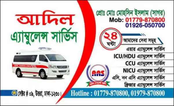আদিল অ্যাম্বুলেন্স জুক্তো আছে 1/Ac অ্যাম্বুলেন্স 2/non Ac অ্যাম্বুলেন্স 3/ icu অ্যাম্বুলেন্স 4/ nicu অ্যাম্বুলেন্স 5/ লাশ বাহি ফ্রীজিং আম্বুলান্স