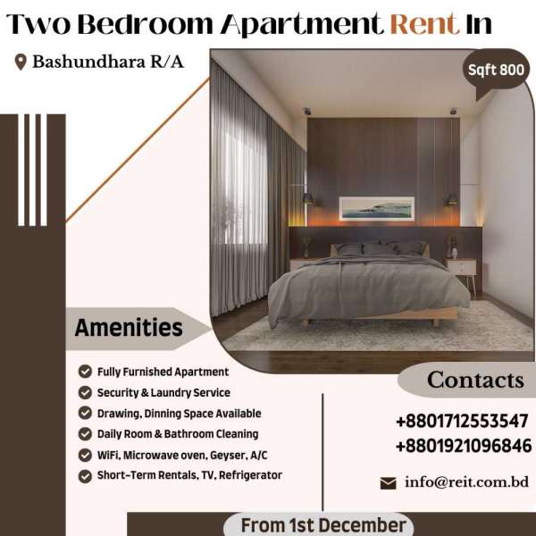 Fully Furnished Two Bedroom Serviced Apartment RENT in Bashundhara R/A. Short-Term Rentals are available with Kitchen, TV, Geyser, Refrigerator, WiFi, Microwave oven, A/C.