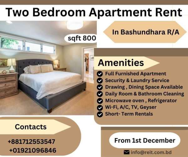 Fully  Furnished Two Bedroom Serviced Apartment RENT in Bashundhara R/A. Short-Term Rentals are available with Kitchen, TV, Geyser,  Refrigerator, WiFi, Microwave oven, A/C.