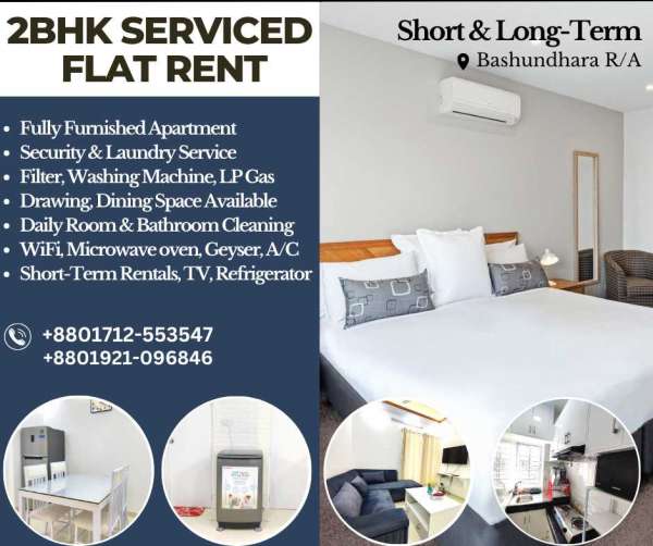 Fully Furnished Two Bedroom Serviced Apartment RENT in Bashundhara R/A. Short-Term Rentals are available with Kitchen, TV, Geyser, Refrigerator, WiFi, Microwave oven, A/C. . Facilities Available >Fully Furnished Apartment >Security & Laundry Service >Filter, Washing Machine, LP Gas >Drawing, Dining Space Available >Daily Room & Bathroom Cleaning >WiFi, Microwave oven, Geyser, A/C >Short-Term Rentals, TV, Refrigerator . YouTube 1. https://www.youtube.com/watch?v=yp440KIPCvc 2. https://www.youtube.com/watch?v=xB_m6tVSiok . Contact For Booking: +88 01712553547 +88 01921096846