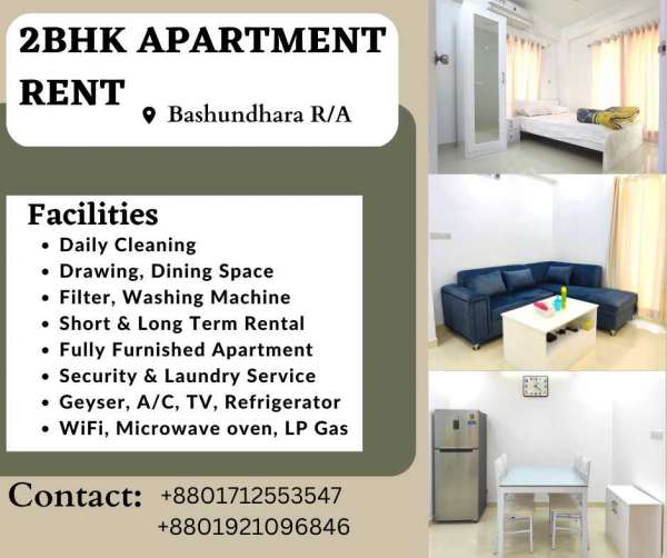 Fully Furnished Two Bedroom Serviced Apartment RENT in Bashundhara R/A. Short-Term Rentals are available with Kitchen, TV, Geyser, Refrigerator, WiFi, Microwave oven, A/C. . Facilities Available >Fully Furnished Apartment >Security & Laundry Service >Filter, Washing Machine, LP Gas >Drawing, Dining Space Available >Daily Room & Bathroom Cleaning >WiFi, Microwave oven, Geyser, A/C >Short-Term Rentals, TV, Refrigerator . Youtube: 1.https://www.youtube.com/watch?v=yp440KIPCvc 2. https://www.youtube.com/watch?v=xB_m6tVSiok . Contact For Booking: +88 01712553547 +88 01921096842