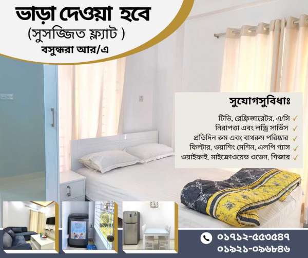 বসুন্ধরা আর/এ তে ২ বেডরুম (সুসজ্জিত) সার্ভিসড অ্যাপার্টমেন্ট ভাড়া দেওয়া হবে। রান্নাঘর, টিভি, রেফ্রিজারেটর, ওয়াইফাই, মাইক্রোওয়েভ ওভেন, এ/সি সহ শর্ট-টার্ম রেন্টাল দেওয়া হয় । . সুযোগ সুবিধা: >টিভি, রেফ্রিজারেটর, এ/সি >নিরাপত্তা এবং লন্ড্রি সার্ভিস >প্রতিদিন রুম এবং বাথরুম পরিষ্কার >ফিল্টার, ওয়াশিং মেশিন, এলপি গ্যাস >ওয়াইফাই, মাইক্রোওয়েভ ওভেন, গিজার . ২ বেডরুমের জন্য ক্লিক করুন: >https://www.hotels.com.bd/rental/apartment-two-bedroom >https://www.youtube.com/watch?v=xB_m6tVSiok . বুকিং এর জন্য যোগাযোগ করুনঃ ০১৭১২-৫৫৩৫৪৭ ০১৯২১০৯৬৮৪৬