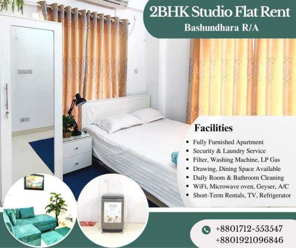 Furnished 2BHK Studio Apartment RENT in Bashundhara R/A. Short-Term Rentals are available with Kitchen, TV, Geyser, Refrigerator, WiFi, Microwave oven, A/C. . Facilities Available >Fully Furnished Apartment >Security & Laundry Service >Filter, Washing Machine, LP Gas >Drawing, Dining Space Available >Daily Room & Bathroom Cleaning >WiFi, Microwave oven, Geyser, A/C >Short-Term Rentals, TV, Refrigerator . Website: https://www.hotels.com.bd/rental/2-bedroom-furnished Youtube: https://www.youtube.com/watch?v=yp440KIPCvc . Contact For Booking: +88 01712553547 +88 01921096842