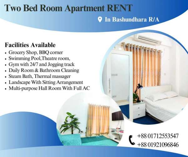 Fully Furnished Two Bedroom Serviced Apartment RENT in Bashundhara R/A. Short-Term Rentals are available with Kitchen, TV, Geyser, Refrigerator, WiFi, Microwave oven, A/C.
