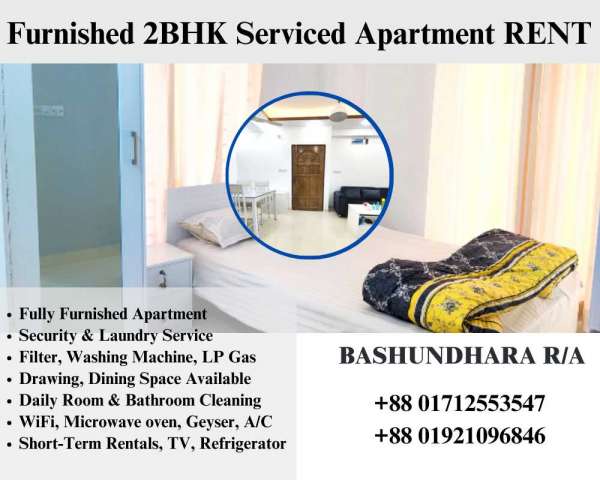 Furnished 2BHK Serviced Apartment RENT In Bashundhara R/A Short-Term Rentals are available with Kitchen, TV, Geyser, Refrigerator, WiFi, Microwave oven, A/C. . Facilities Available: >Fully Furnished Apartment >Security & Laundry Service >Filter, Washing Machine, LP Gas >Drawing, Dining Space Available >Daily Room & Bathroom Cleaning >WiFi, Microwave oven, Geyser, A/C >Short-Term Rentals, TV, Refrigerator . Website: https://www.hotels.com.bd/rental/apartment-two- Youtube: https://www.youtube.com/watch?v=xB_m6tVSiok . Contact For Booking: +88 01712553547 +88 01921096846 Address: JCX TOWER, 1136/A, Block-I, Level 5 Japan Street, Bashundhara R/A