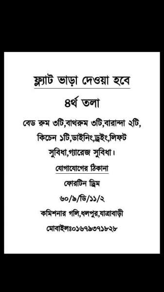 Three Bed rooms,Dining plus drawing room,two balcony,lift facilities,Garage facilities,three Washrooms. N.B:The above flat fare is not including gas & electricity.